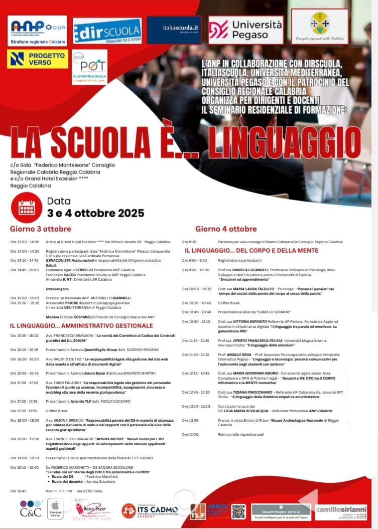 Cosa favorisce l’apprendimento dei ragazzi oggi? Una domanda più che mai attuale, considerando i dati in peggioramento dal 2019 sulle compentenze alfanumeriche degli studenti italiani, accompagnati dai segnali preoccupanti sul burn out dei docenti. E l’ANP Calabria, guidata da Domenico Servello, ha deciso di affrontare a tutto campo gli aspetti più importanti delle nuove sfide educative, nel seminario residenziale per dirigenti e docenti “La scuola è…linguaggio” che si è svolto il 3 e 4 ottobre a Reggio Calabria, nella sede del Consiglio Regionale (ente patrocinatore), in collaborazione con Dirscuola, Italiascuola, Università Mediterranea (presente con la professoressa di pedagogia generale Alessandra Priore) e l’Università Pegaso. Tanti gli interventi di spessore sugli aspetti amministrativi, psicologici e didattici della scuola al tempo dei social (si veda locandina a fianco), seguiti ai saluti di Servello, del presidente struttura ANP Reggio Calabria Francesco Sacco e del direttore Usr Calabria, Antonella Iunti, e moderati da Cristina Costarelli, presidente consiglio nazionale ANP.