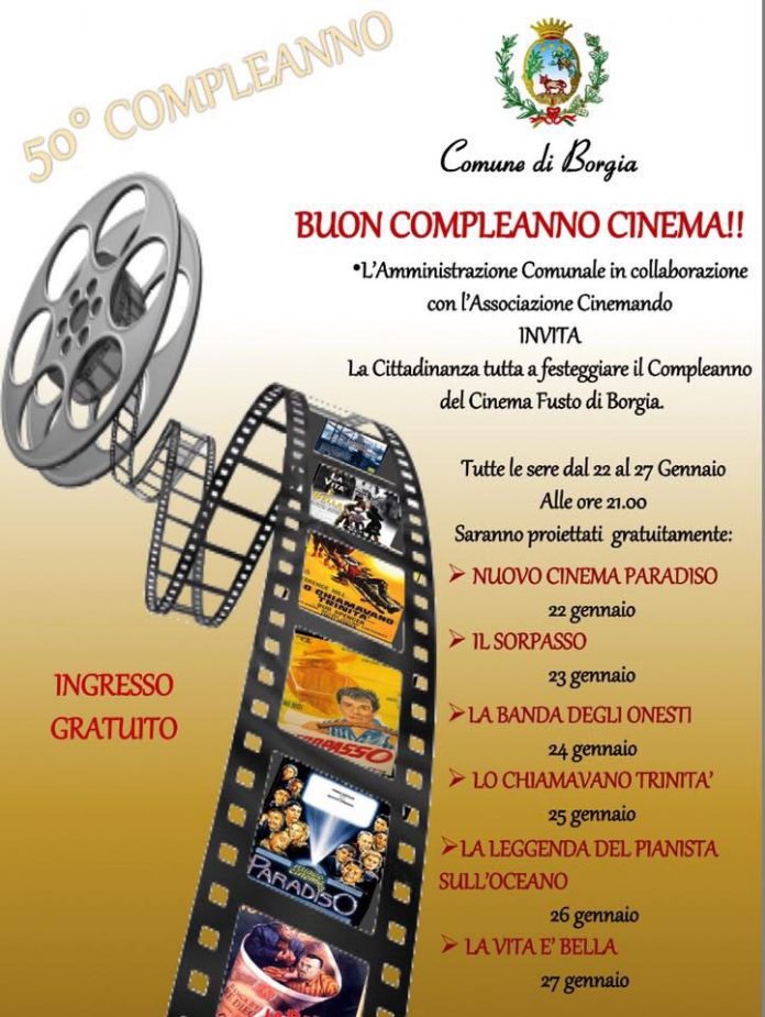 E così continua la rassegna “Buon compleanno cinema!”, voluta e organizzata dall’amministrazione comunale di Borgia, guidata dal sindaco Elisabeth Sacco, l’amministrazione comunale e dall’associazione Cinemando per festeggiare i 50 anni del Cinema Fusto. Il primo dei sei film proiettati gratuitamente alle 21 da lunedì 22 gennaio è stato “Nuovo cinema Paradiso”, e dopo il film di questa sera “Il sorpasso”, continua oggi con “La banda degli onesti”, giovedì 25 con “Lo chiamavano trinità”, venerdì 26 con “La leggenda del pianista sull’oceano” per concludere sabato 27 con “La vita è bella”.