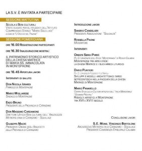 Interventi: Oreste Sergi Pirrò, Ph. D. Università degli studi Mediterranea di Reggio Calabria: “Montepaone tra arte e fede: la chiesa Matrice e i suoi arredi liturgici”; Dario Puntieri, Ph. D. Università Federico II di Napoli: “Sviluppi e modelli architettonici tardo settecenteschi nella facciata della chiesa Matrice di Montepaone”; Mario Panarello, Centro Studi sulla Cultura artistica dell’Italia Meridionale Giovanni Previtali: “Risvolti artistici a Montepaone tra XVI e XVIII secolo”.