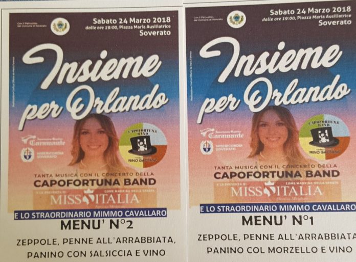 Il tempo dovrebbe reggere ed è dato in rasserenamento in serata. I menù legati all’iniziativa Insieme per Orlando, con zeppole, penne all’arrabbiata, vino e a scelta panino con salsiccia o morzello sono già in preparazione, e per chi volesse potranno essere anche acquistati da asporto e gustati a casa. L’ideale, ovviamente, è però mangiarli godendosi il mega show, al quale parteciperà la Capofortuna Band, i Kiss the cats e il grande Mimmo Cavallaro, con la Miss Alice Rachele Arlanch a fare da ospite d’onore. E tante sorprese e video inediti tutti da scoprire. Grandi gli sforzi profusi per questa serata da parte degli organizzatori, la Misericordia e il quartiere Caramante di Soverato, insieme all’amministrazione comunale e all’assessore alle politiche sociali Sara Fazzari che segue da vicino la vicenda. Non mancate!