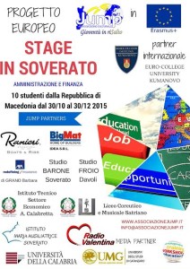 Una volta rotto il ghiaccio con l’accoglienza fornita dallo staff di Jump, gli studenti universitari di economia arrivati dalla Macedonia hanno iniziato a vivere l’esperienza di stage lavorativo disegnata dal progetto europeo Jump with Us: stage in Soverato e finanziata dal programma Erasmus plus. Il partenariato vincente coinvolge l’associazione Jump, l’università privata dell’Euro College di Kumanovo, l’Unical e un network di tre istituti scolastici, due studi commerciali, due imprese e un’agenzia assicurativa del territorio di Soverato (Cz). Per la rete locale coinvolta un grande impegno, un importante segnale di apertura ma anche un’opportunità per poter avviare strategici processi di internazionalizzazione.