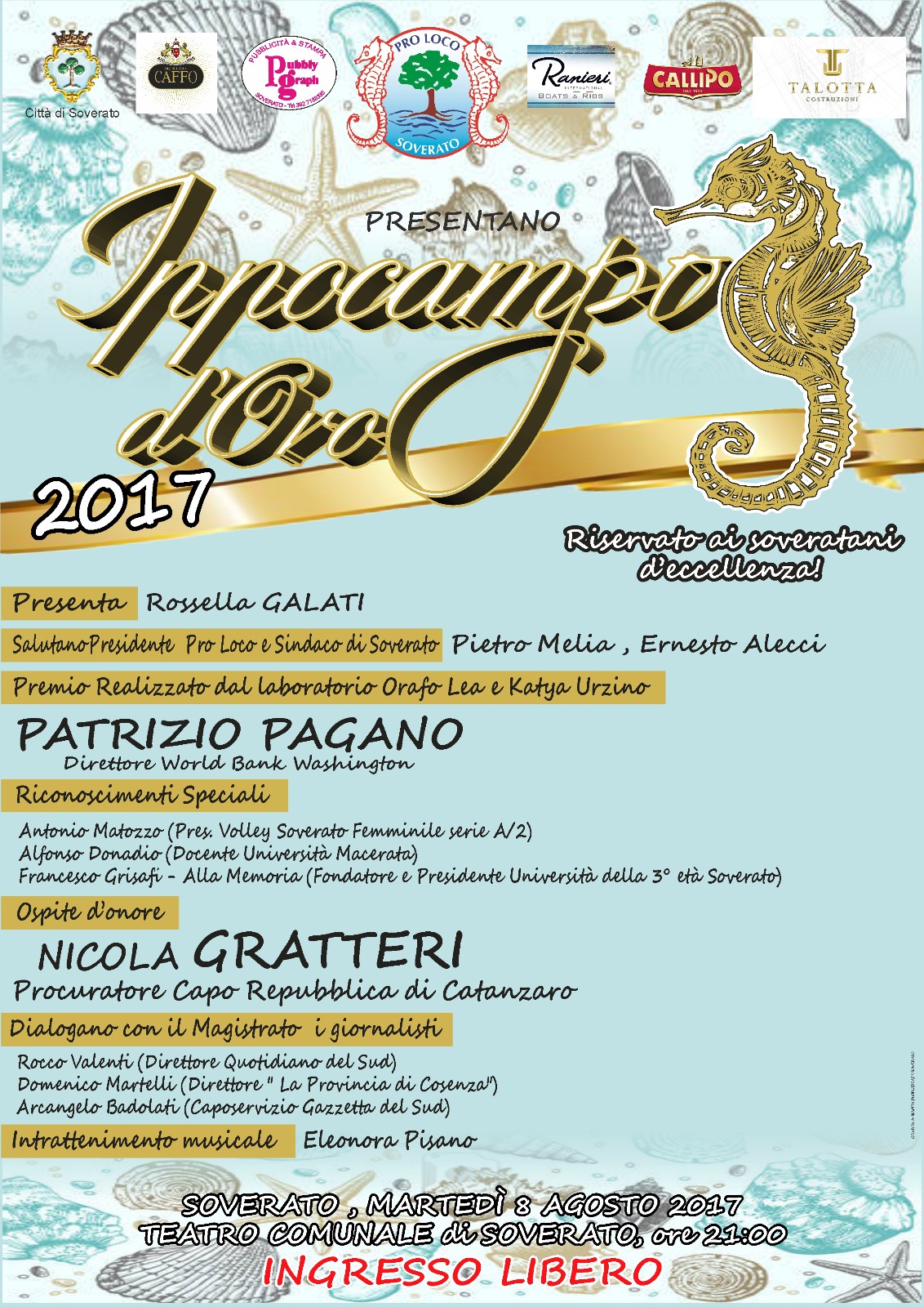 Ippocampo d’oro 2017 stasera a Soverato. Ecco in locandina il premiato d’eccellenza, i riconoscimenti speciali, gli ospiti, i presentatori e i giornalisti prescenti per questa edizione, targata Città di Soverato e Pro loco, alla presenza del sindaco Ernesto Alecci e del presidente della pro loco Pietro Melia. Appuntamento alle 21.30 in teatro.